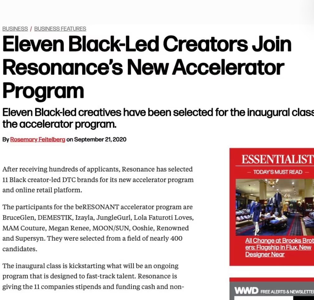Awarded $50,000 in manufacturing support as one of 11 selected Black-owned brands by Be Resonant.