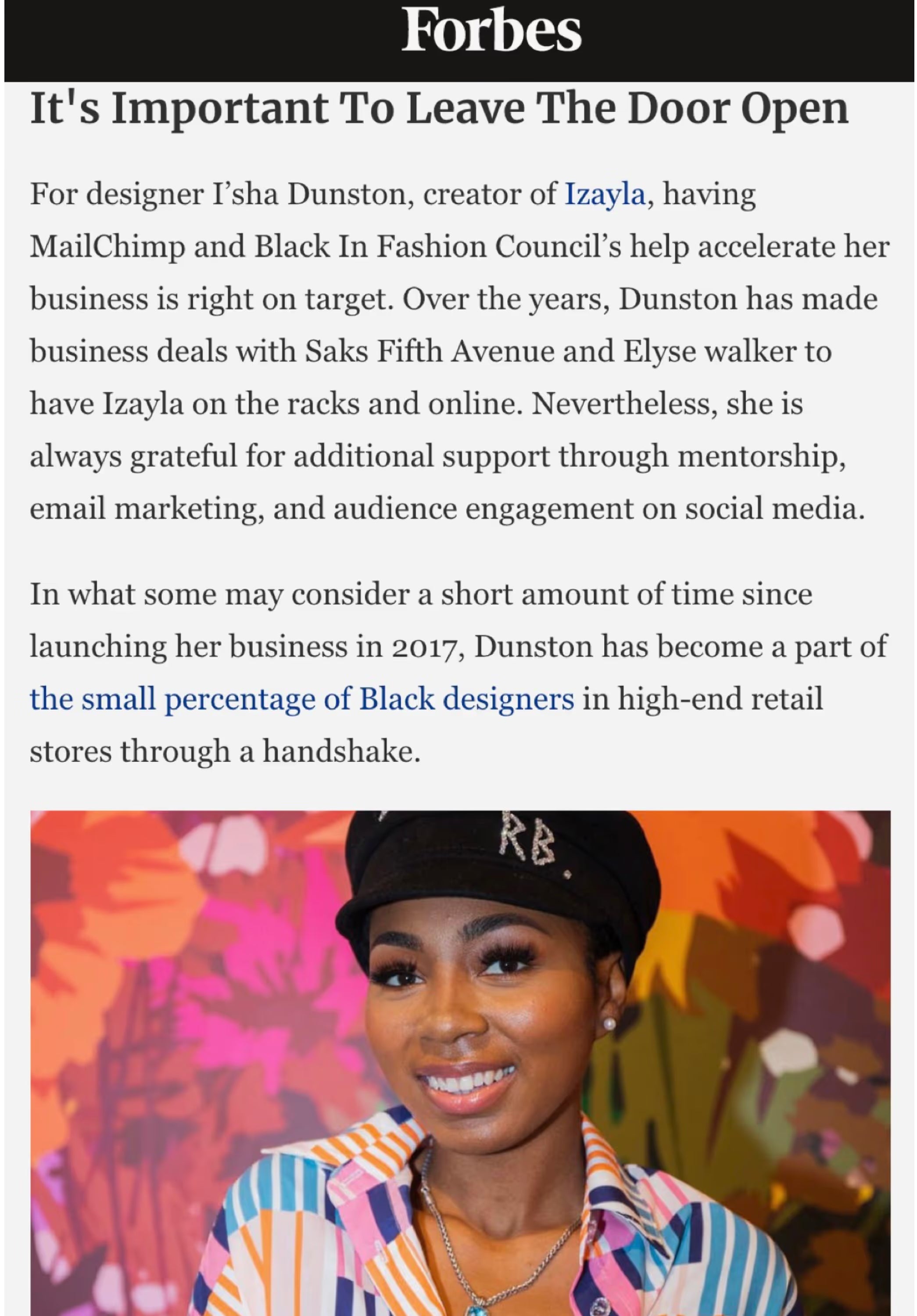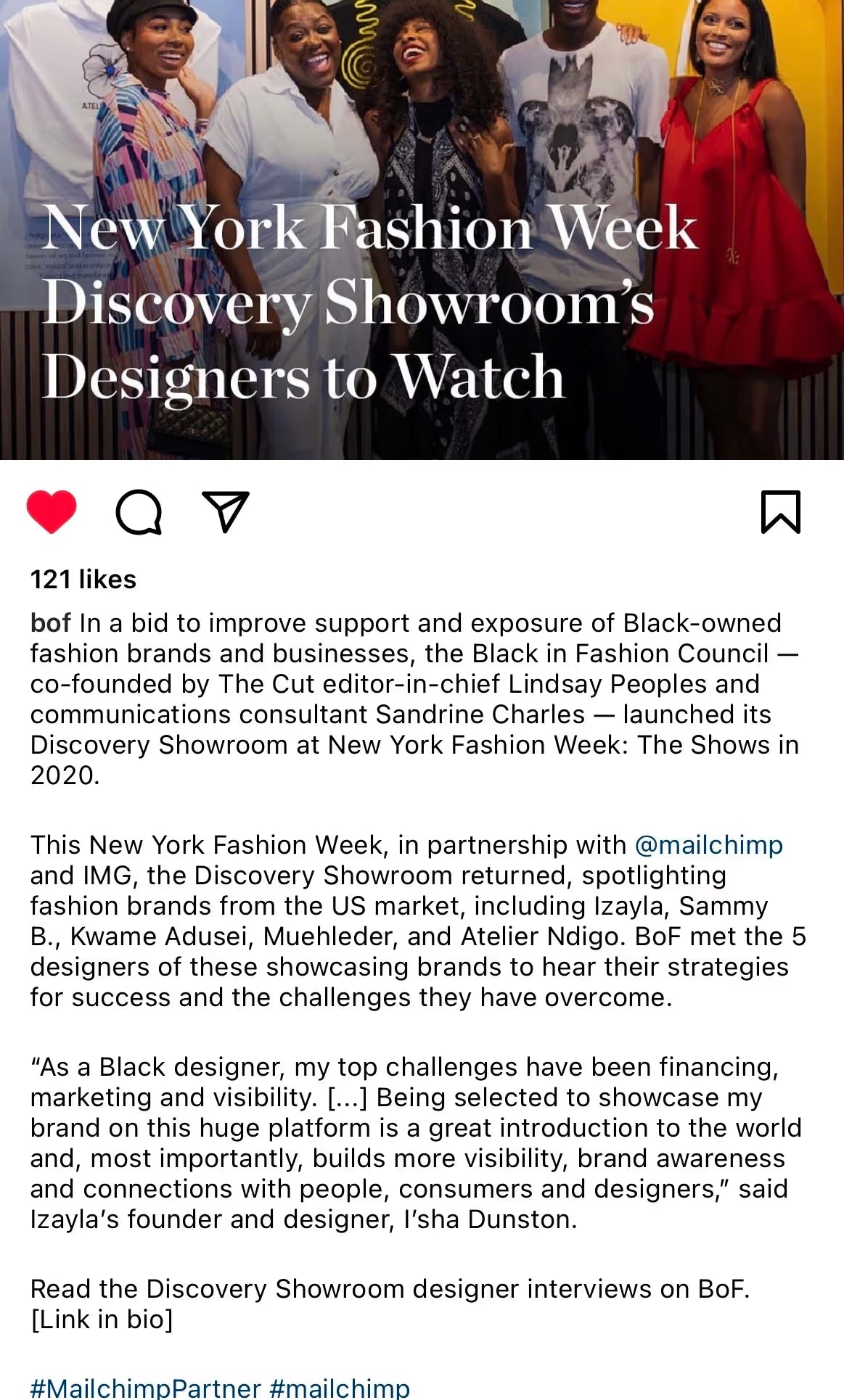 Selected by the Black in Fashion Council to showcase IZAYLA at New York Fashion Week in partnership with Mailchimp.