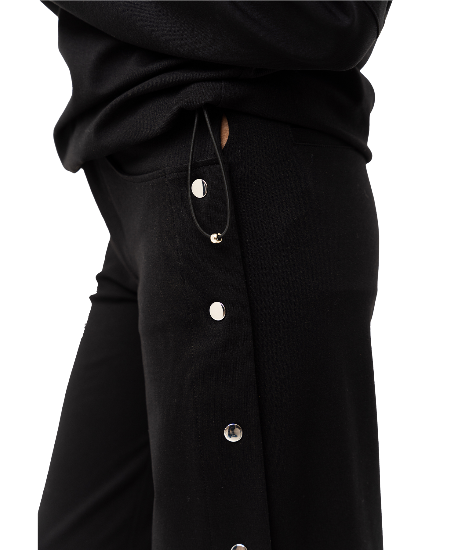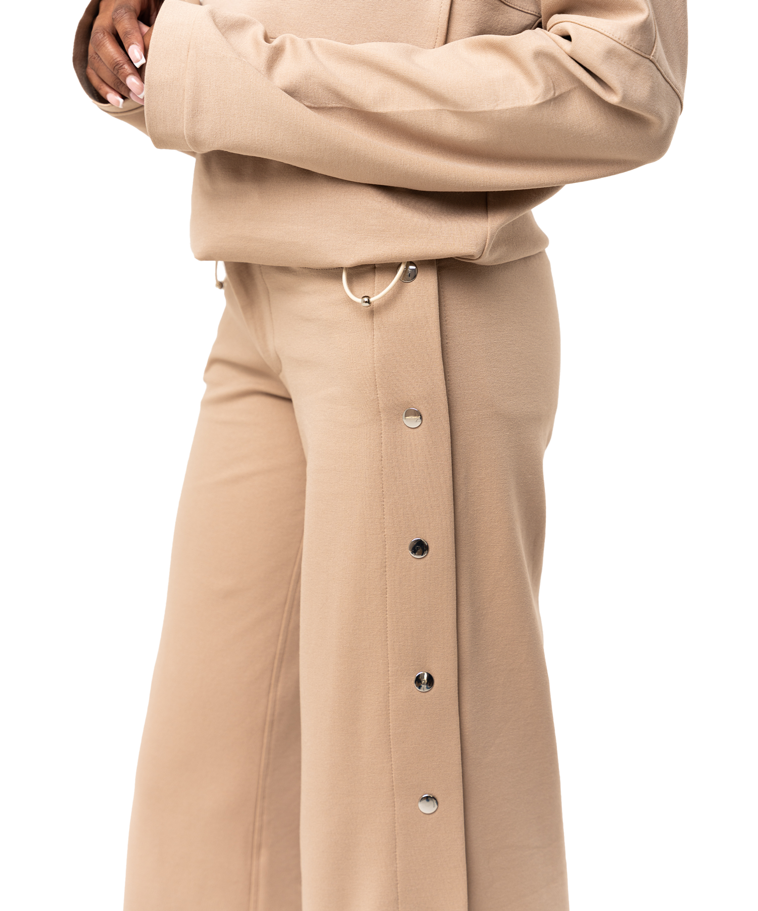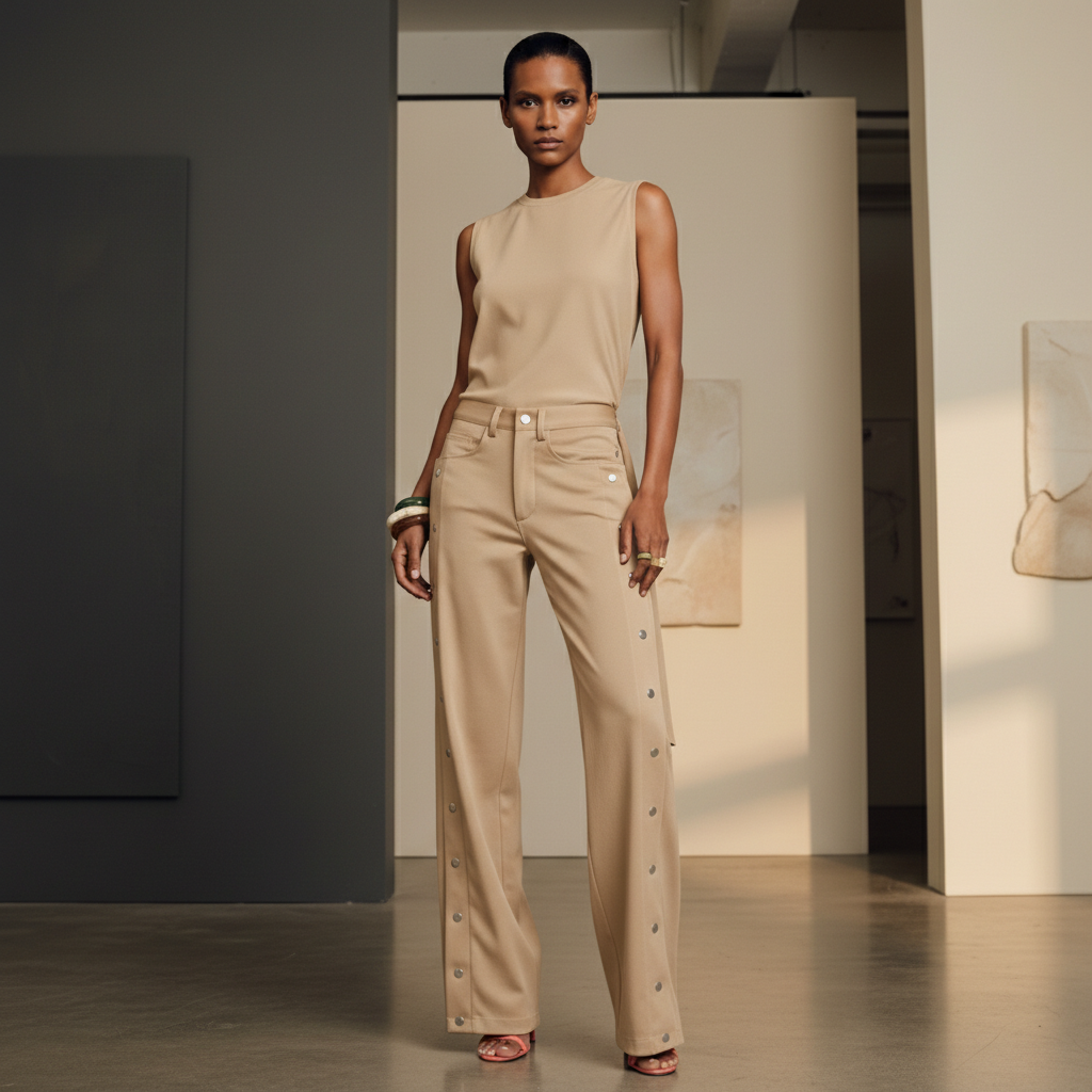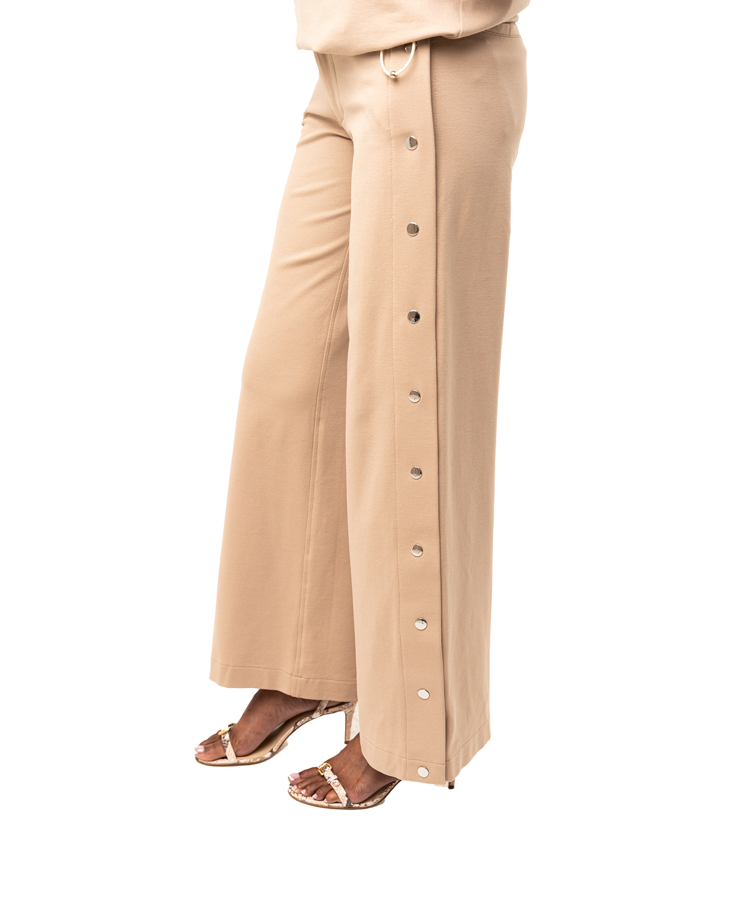 Modern tailoring with a touch of ease. The Sovana Tear-Away Pants are designed with a flattering high rise, a wide leg through the thigh, and sleek snap detailing along the side seams—offering a versa