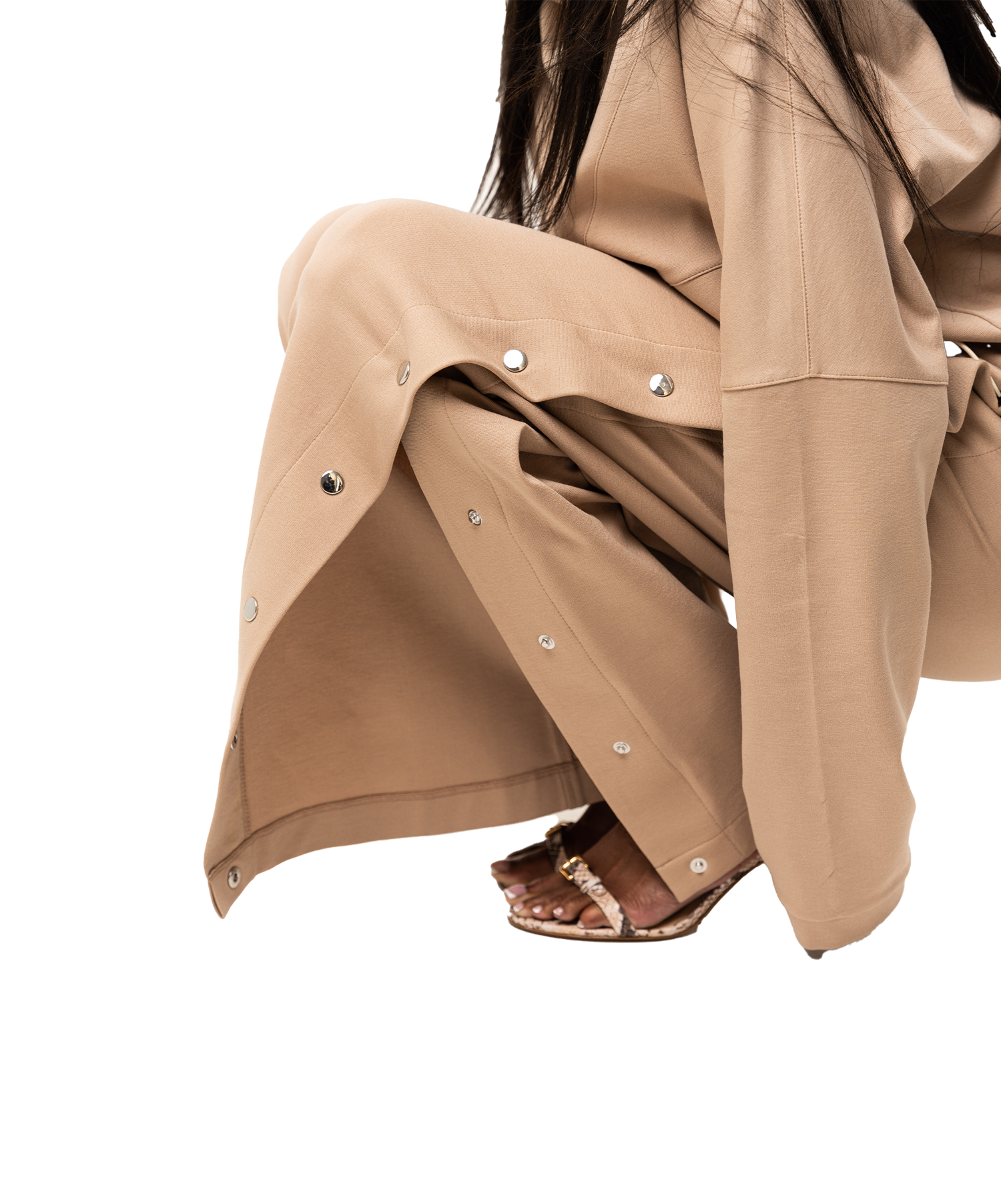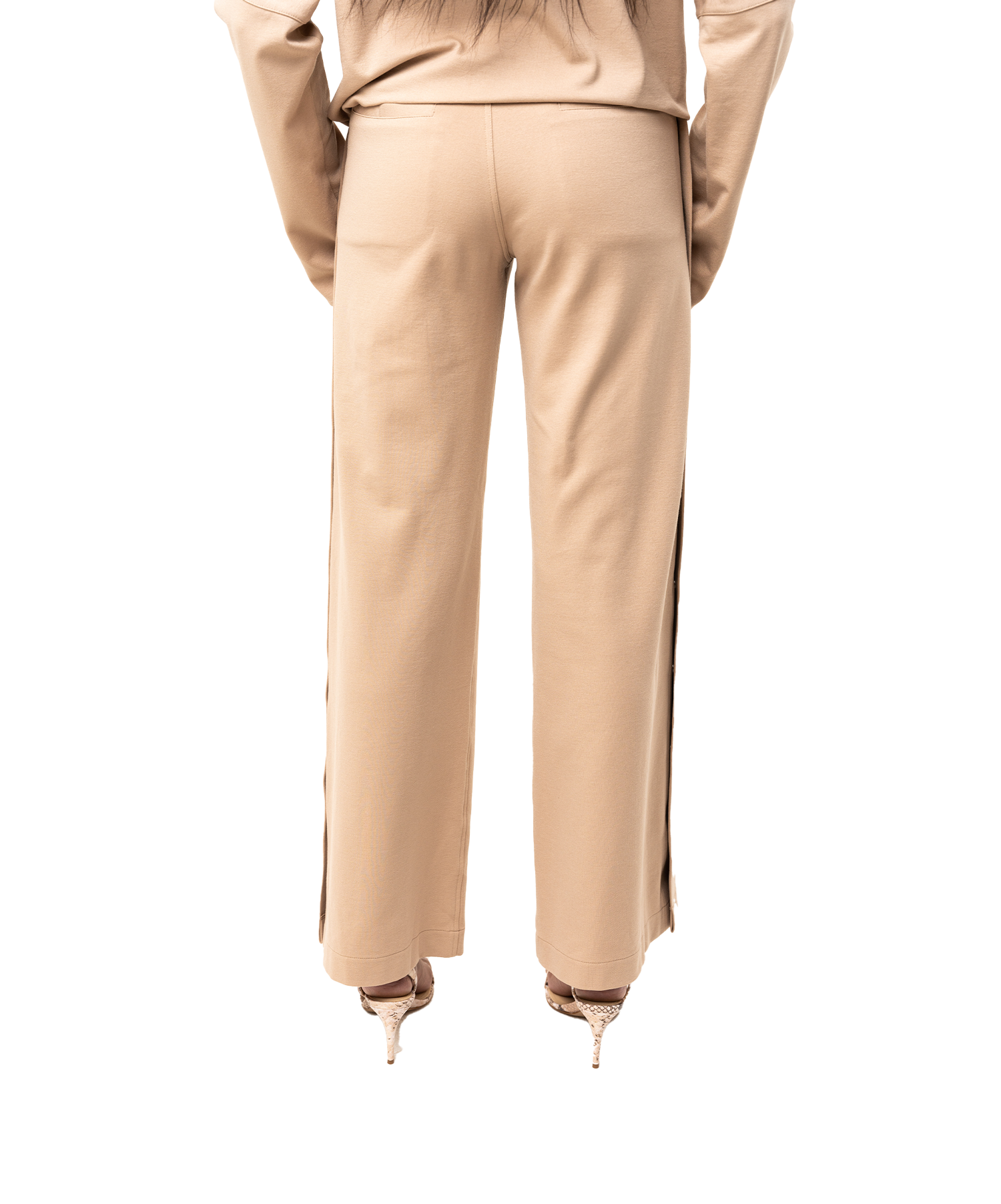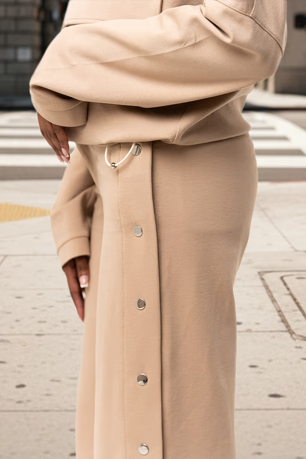 Modern tailoring with a touch of ease. The Sovana Tear-Away Pants are designed with a flattering high rise, a wide leg through the thigh, and sleek snap detailing along the side seams—offering a versa