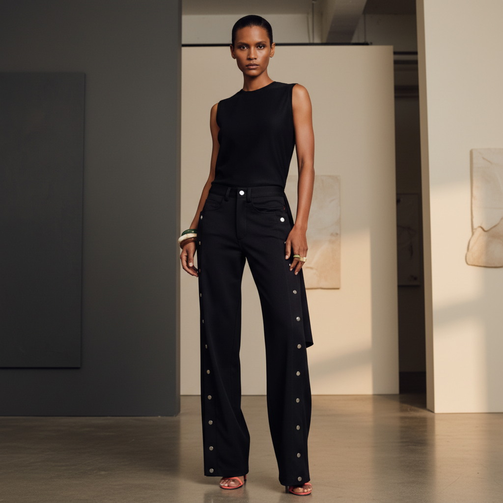 Modern tailoring with a touch of ease. The Sovana Tear-Away Pants are designed with a flattering high rise, a wide leg through the thigh, and sleek snap detailing along the side seams—offering a versa